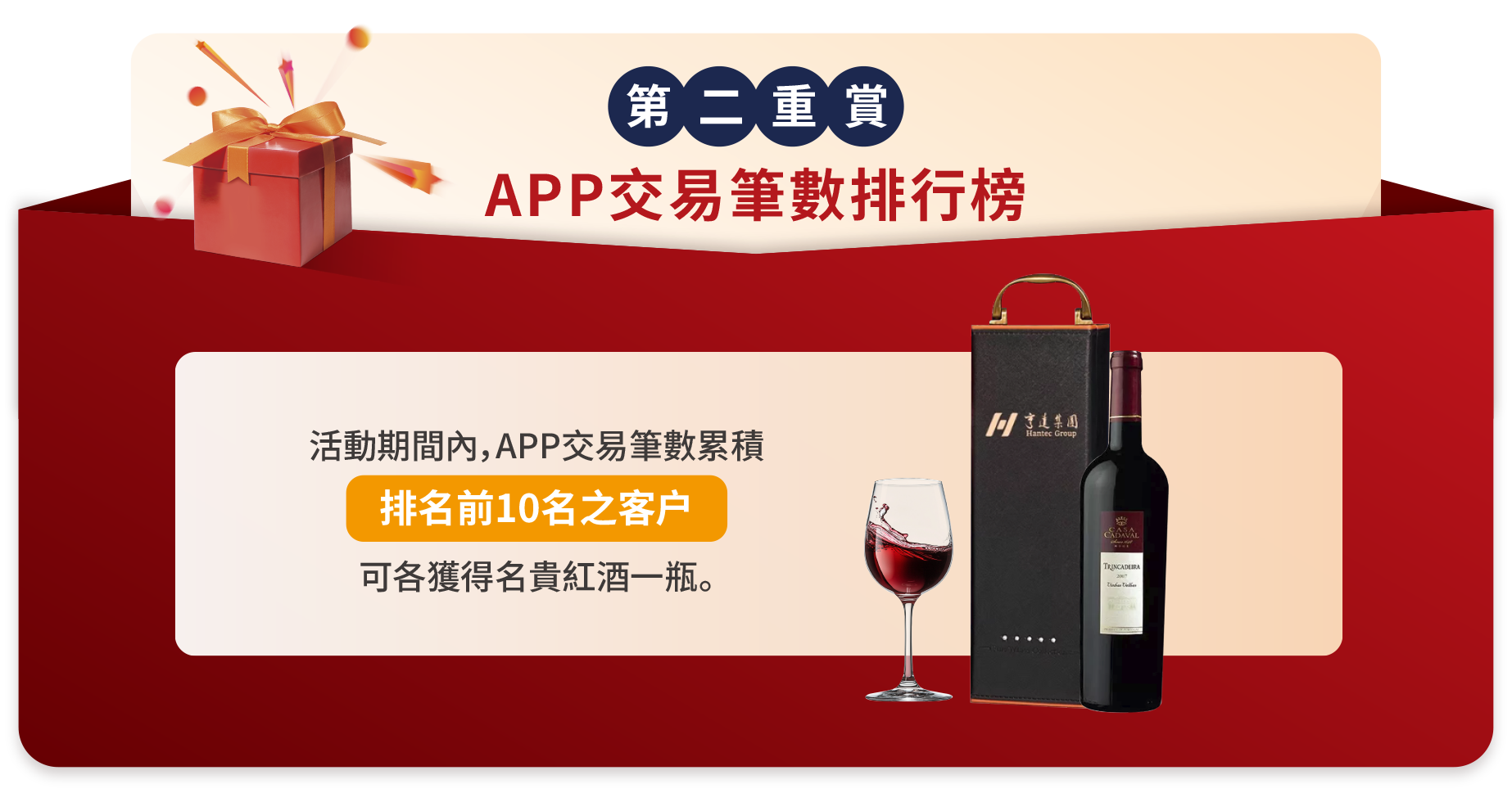 ★ 第二重賞:活動期間APP交易筆數累計排名前10名的客戶將各自獲得一瓶名貴紅酒。 - 每位客戶可分別獲得第一重賞和第二重賞獎品,即同一客戶可同時獲得兩份獎品,前提是符合各重賞條件。